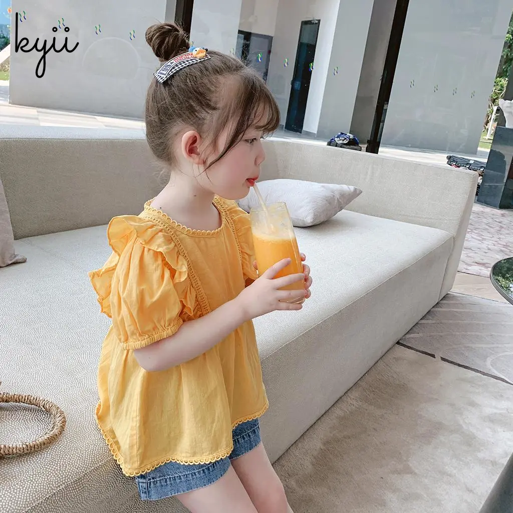 KYII Girls New Children Cotton Short Sleeve Shirt Summer Dress Western Style Baby Shirt Bubble Sleeve Top ky074