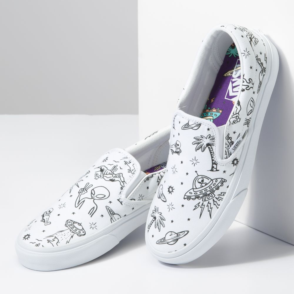 Featuring allover artwork that mixes aliens and UFOs with iconic palm tree and desert images ready for your unique creative twist, the Unidentified U-Paint Classic Slip-On is an everyday essential with true “Off The Wall” style. This timeless slip-on shoe also includes low profile canvas uppers, supportive padded collars, elastic side accents, and signature rubber waffle outsoles.