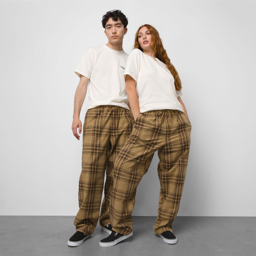 Built around an easy pull-on elastic waist for all-day, everyday wear, this versatile pant features a long rise at the waist that stays baggy through the hip and thigh, ending in a tapered leg. The cotton fabrication offers a soft hand feel, while an allover plaid print and subtle brand details keep the style on point: Drop-V bar tack embroidery at the side seam and pockets, a key loop on the right rear waistband, and a branded flag label sewn into the hem of the leg opening that’s visible when cuffed.